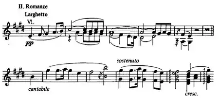 The Romanze, although not strictly in sonata form, has its second theme of the exposition ascribe to the classical model of modulating to the dominant (I-V), and, when it returns, it modulates to the mediant (III). Chopin wrote in the same letter to Tytus, saying, “It is not meant to create a powerful effect; it is rather a Romance, calm and melancholy, giving the impression of someone looking gently towards a spot that calls to mind a thousand happy memories. It is a kind of reverie in the moonlight on a beautiful spring evening.”[9] The second movement has been described as "unashamedly heart-on-your-sleeve stuff."[10]