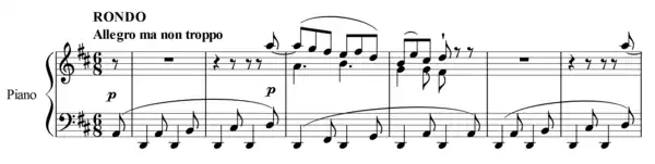 The final movement is a rondo. Out of not only his piano sonatas but all of his published works up to this point, this is the first time that Beethoven decides to write ma non troppo. Some critics attribute the repeating bass line to a bagpipe, others to a dancing gigue. Beethoven employs various amusing, interesting and very adventurous episodes, all with different moods, rhythms, and harmonic texture. The coda, played a little faster than the allegro (Più allegro), can be termed as the only 'virtuoso' passage in the whole sonata.