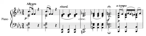 Beethoven's progressive harmonic language is apparent from the very first chord of the piece (third inversion of the eleventh on dominant B♭[3]); the stability of a tonic chord in root position is delayed until bar 8. The expressive harmonic colour coupled with the changes of tempi in the introduction (mm. 1–18) create an evocative opening, reminiscent of the improvisatory style of C. P. E. Bach's piano sonatas. This opening cell is repeated extensively throughout the movement – at the start of the development (m. 89), in the recapitulation (m. 137), and during the coda (transposed into the subdominant A♭ (m. 220), and then at its original pitch (m. 237)). The modulatory passage between the first and second subjects (mm. 33–45) explores the opening chord, but in a minor variation (with a C♭, implying ii7 of E♭ minor), even appearing in bar 36 in the exact spacing (albeit with different spelling) of the Tristan chord written by Richard Wagner some 55 years later.