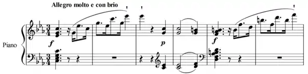 The third movement is in sonata form, making heavy use of a figure of five eighth notes. The short development section contains an unmistakable foreshadow of the theme from Beethoven's Symphony No. 5. The coda slows the tempo down, leading to a final outburst which fades to a quiet Picardy third on a leading-tone IAC, giving a sense of relief.