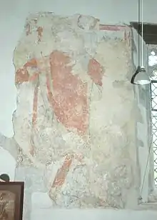 A number of Perpendicular Gothic windows were later added to the nave and one to the north wall of the chancel.[3][4] The present belltower was built in the 16th century.[3][4] St. Nicholas' parish church was repaired in 1826 and restored in 1855.[3] In 1898 it was restored again under the architect John Oldrid Scott,[3] whose alterations included replacing the chancel arch.[4] A 14th-century wall painting of Saint Christopher on the north wall of the nave was discovered in 1896 and restored in 1935.[1] St. Nicholas' church is a Grade II* listed building.[3]