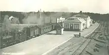 In the 1880s, the village of Pieksämäki was located west to the current place of the town at Tienristi, currently known as Yläristi, and so the people of the municipality would have wanted the track to go west of Pieksänjärvi. However, because of cost reasons, in 1885 the government decided to build the track east of the lake, bringing the station a couple of kilometres east of the village, in the middle of an uninhabited swamp.[2] The first station building was very modest. The stations were divided into five classes in order of importance, with class 1 being the most important; originally, the Pieksämäki station was of class 4.[2] The village of Haapakoski located near Pieksämäki also received its own station, of class 5. Originally, cargo traffic was more important, and there was only passenger traffic to Mikkeli and Kuopio. Nevertheless, people started moving near the station, attracted by the railroad.