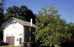 The springhouse, built in 1801, is located in the median of Tilden Street west of the barn.