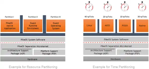 Software partitions are also called virtual machines (VMs), because it is possible to implement a complete guest operating system inside a partition which executes independently from other partitions and thus can address use cases with mixed criticality. PikeOS can be seen as a Type 1 hypervisor.