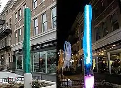 Pillar of Fire is a 16 feet (4.9 m) high illuminated glass sculpture in the shape of a slender column which represents the pillar of fire that guided the Israelites at night.[1][2][3] The glass weighs 2,000 pounds and is rigidly post-tensioned to a durable glass and steel rod placing the column under 15,000 pounds of pressure. The column is composed of 370 egg-shaped layers of float glass with unpolished edges that reflects natural light and is illuminated from within. The glasses ever-changing lights responds to changing atmospheric and lighting conditions throughout the day. An internal and external programmable lighting system creates the illumination. The color design at night is an abstraction of the rainbow flag, a symbol of LGBT pride.[1][2] A plaque on the sculpture's concrete base says the artwork is dedicated to "Whitman-Walker Clinic and the many health care workers who served the LGBT community in this building from 1987 to 2008, the early years of the pandemic."[4]