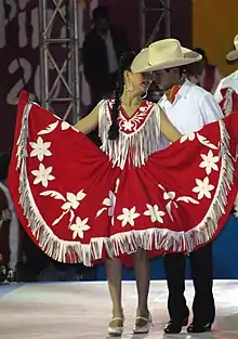 2011 marked the twenty second annual event, which originally was called the Concuso Nacional de Baile de Huapango y Reunión de las Huastecas.[20][21] In this year, there were more than 400 couples registered in the competition with about 10,000 spectators in attendance, as the event grows each year.[18] The event is held at the Casa de la Cultura (House of Culture), with three categories: children's (under 12), youth (13 to 17) and adult (over 18). Entrance fee is 100 pesos per couple. Various styles of Huapango dance is presented including hidalguense, poblano, potosino, queretano, tamaulipeco and veracruzano, named after the states of Hidalgo, Puebla, San Luis Potosí, Querétaro, Tamaulipas and Veracruz respectively. It begins on Friday night and concludes on Sunday night. The children's category is exposition only, with the other two having eliminations. The judging panels are made up of representatives of these states, who qualify technique, dress, projection, coordination and precision. The winners of various categories received between four and six thousand pesos, with the overall winner for each age group receiving between 14,000 and 20,000 pesos. Those couples who have won the grand prize in previous years are not allowed to participate again together. For 2011, the groups presenting live music for the event included Los Hidalguenses, Reales de Colima and Huapangueros Differentes.[20][21] The event is concurrent with the Fiestas Patronales or feast day of the patron saint of the municipality. This event in 2011 featured popular rock groups such as Pambo Pop-rock and Pega Pega de Emilio Reyna.[22]