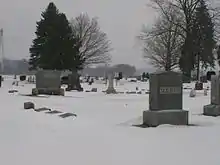 The Pinhook Cemetery, established in 1850, is divided into four sections with a single gravel road entering off of State Road 2 near the intersection of Wozniak Road and exiting onto Wozniak Road on its east boundary. It is bordered by State Road 2 on the south, Wozniak Road on the east, and agricultural tilled lands on the north and west. The church is located in its southwest corner. State Road 2 forms a gentle curve northward from the west edge of the cemetery to Wozniak Road. The cemetery is fenced on the east side, and partially on the south side, by a white vinyl picket fence. Newer brick piers flank the entrance and exit. Several mature deciduous and cedar trees are located in the cemetery.[2]