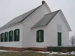 The front (south) facade is symmetrically with the vestibule projecting from the main building. Above the front door is a wood sign with the name of the church and year of construction. The corner boards on the main building, in keeping with the Greek-Revival style however, terminate at the horizontal entablature wrapping around from the east and west facades, with decorative trim making the appearance of a pilaster cap.[2] The frieze board of the gable then extends up the face of the gable from this horizontal detail. A cove trim piece is located at the juncture of the frieze board and wood soffit of the eave.[2]