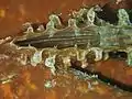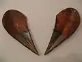 The bivalve shell is usually 30–50 cm (1.0–1.6 ft) long,[5] but can reach 120 cm (4 ft).[3] Its shape differs depending on the region it inhabits. Like all pen shells, it is relatively fragile to pollution and shell damage. It attaches itself to rocks using a strong byssus composed of many silk-like threads which used to be made into cloth. The animal secretes these fibres from its byssus gland; they consist of keratin and other proteins and may be as long as 6 cm (2.4 in). The inside of the shell is lined with brilliant mother-of-pearl.[6]
