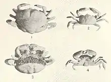 Pea crabs, family Pinnotheridae, are small crabs that live symbiotically with clams, tube worms, sea cucumbers, and other fauna. Usually they feed on the results of their host's filtering, or in the case of sea cucumbers they live in the cloaca feeding off of the results of digestion and reproduction. They have no rostrum and no teeth between the eyes.[3]