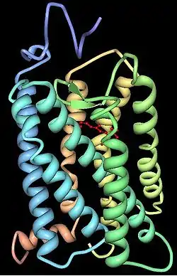 - Palczewski K, Kumasaka T, Hori T, Behnke CA, Motoshima H, Fox BA, et al. (August 2000). "Crystal structure of rhodopsin: A G protein-coupled receptor". Science. 289 (5480): 739–45. Bibcode:2000Sci...289..739P. CiteSeerX 10.1.1.1012.2275. doi:10.1126/science.289.5480.739. PMID 10926528.