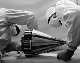 ![]() Pioneer 3 being inspected before shipping to Cape Canaveral | |