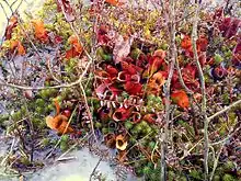 Foraging, flying, or crawling insects such as flies are attracted to a cavity formed by the cupped leaf, often by visual lures such as anthocyanin pigments, and nectar. The rim of the pitcher (peristome) is slippery when moistened by condensation or nectar, causing insects to fall into the trap. Pitcher plants may also contain waxy scales, protruding aldehyde crystals, cuticular that insects cannot climb out.[1] The small bodies of liquid contained within the pitcher traps are called phytotelmata. They drown the insect, whose body is gradually dissolved. This may occur by bacterial action (the bacteria being washed into the pitcher by rainfall), or by digestive enzymes secreted by the plant itself. Pitcher trap fluids largely vary in their viscoelasticity and acidity which then dictates which type of prey they can target. For example, increased viscoelasticity is associated with increased insect retention to help capture flying insects such as flies, whereas increased fluid acidity can decrease insect killing-time which can help capture crawling insects such as ants.[5] Some pitcher plants contain mutualistic insect larvae, which feed on trapped prey, and whose excreta the plant absorbs.[6] Whatever the mechanism of digestion, the prey items are converted into a solution of amino acids, peptides, phosphates, ammonium and urea, from which the plant obtains its mineral nutrition (particularly nitrogen and phosphorus). Like all carnivorous plants, they all grow in locations where the soil is too poor in minerals and/or too acidic for most plants to survive. Pitcher plants supplement available nutrients and minerals (which plants normally obtain through their roots) with the constituents of their insect prey.