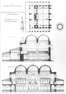 ![]() Cross sections and plan of the mosque published by Cornelius Gurlitt in 1912 | |
