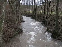 The Platißbach initially flows in a northern direction. After about one kilometre (0.6 mi) it collects an unnamed stream from the left and changes direction to head east. On reaching the B 265 it changes course again and flows parallel to the road in a northwesterly direction to its mouth. On its way it flows through the Platißbach Valley Nature Reserve.[2] The Platißbach picks up other tributaries from both sides, near Platiß (a district of Hellenthal), the only village it passes, at a height of about 422 m, it is joined by its main tributary, the Prether Bach. In Hellenthal it empties into the Urft tributary, the Olef, at about 403 m.