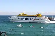There are three ferry lines to choose from in which to make the journey. Firstly there is the Fred. Olsen Express ferry, called the 'Bocayna Express' which makes the trip in 20 minutes. The second ferry is the Naviera Armas, called the 'Volcan de Tindaya', which makes 7 daily crossings each way, each one being of 35 minutes duration. The third is the 'Princesa Ico Glass Bottomed Boat'.
