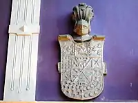 On the south side of the square is the Pazo de los Cru y Montenegro, which crosses Don Gonzalo street with its pointed arch. This manor house dates back to the 15th century, although it has undergone numerous subsequent modifications, particularly in the 16th and 19th centuries. Its façade was rebuilt in the Baroque style and it has a large stone coat of arms from the 17th century, known as the Coat of Arms of the Twelve Lineages,[14] with the arms of Montenegro, Mariño, Sotomayor and Cru, and French windows with balconies on the upper floor. The manor house preserves the remains of its original crenellated tower, whose battlements have been replaced by a conventional roof.[15][16]
