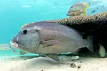 Plectorhinchus caeruleonothus was previously considered to be legendary[3] which existed only in fishermen tales. The fish is very difficult to catch.[4] Plectorhinchus caeruleonothus was identified through several features unique to it, such as a distinctive pattern on juveniles and small nostrils.[5] It is thought that the fish likely evolved its tough ways to survive the many sharks and crocodiles that share its habitat in reef waters off northern Australia.[6] It was formally described in 2015 by Jeffrey W. Johnson and Jessica Worthington Wilmer with the type locality given as Boyd Bay, southwest of Weipa in Queensland.[7] Previously, this species was thought to be a taxon synonymous with the minstrel sweetlips (Plectorhinchus schotaf) of the western Indian Ocean, as were the sombre sweetlips (Plectorhinchus unicolor) of Japan to northern Australia and Plectorhinchus griseus from India and Sri Lanka, but all are now recognised as valid species[5][7] The specific name is a compound of caeruleus meaning “blue”, which refers to the blue sheen in life, and nothus meaning “bastard”, reflecting the name given to this species by anglers. [8]