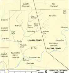 The Plunketts Creek watershed drains parts of Cascade, McNett, and Plunketts Creek townships in Lycoming County, and Fox and Hillsgrove Townships in Sullivan County (with most of the watershed in Plunketts Creek Township). The drainage basin area is 23.6 square miles (61 km2), accounting for 4.78% of the 494 square miles (1,280 km2) Loyalsock Creek watershed.[5] Bear Creek, whose mouth is also within the village of Barbours but on the opposite (left) bank, is the nearest major creek at 0.52 miles (0.84 km) downstream, as measured along Loyalsock Creek. (It is also known as "Big Bear Creek" as it is the watershed upstream of "Little Bear Creek".) The neighboring major watersheds on the same bank are Wallis Run (9.56 miles (15.39 km) downstream) and Mill Creek (at the village of Hillsgrove, 9.16 miles (14.74 km) upstream).[5] Pleasant Stream, a tributary of Lycoming Creek, is the watershed to the north.[3]