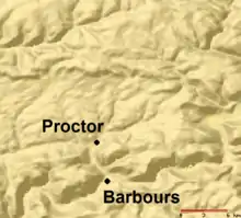 In 1868, Proctor was built as a company town in the midst of the timber required for the tannery (Barbours had initially been considered for the site). The second village on Plunketts Creek was originally named "Proctorville" for Thomas E. Proctor of Boston, who produced leather for the soles of shoes there. Proctor was brought to the area by William Stone of Standing Stone Township in Bradford County, who knew the area was "one vast tract of hemlock timber".[44] The Proctor tannery employed "several hundred" at wages between 50 cents and $1.75 a day, the employees living in one hundred twenty company houses, each renting for $2 a month.[6][35][44] Hemlock bark, used in the tanning process, was hauled to the tannery from up to 8 miles (13 km) away in both summer and winter, using wagons and sleds. The hides which were tanned to make leather came from the United States, and as far away as Mexico, Argentina, and China.[45] In 1892, Proctor had a barber shop, two blacksmiths, cigar stand, I.O.O.F hall, leather shop, news stand, a post office (established in 1885), a two-room school, two stores, and a wagon shop.[6][35] Finished sole leather was hauled by horse-drawn wagon south about 8 miles (13 km) to Little Bear Creek, where it was exchanged for "green" hides and other supplies brought north from Montoursville.[35]