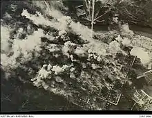 After the Yugoslav coup d'état on 27 March 1941, demonstrations supporting the coup took place in Podgorica.[13] As a result of the coup, Yugoslavia turned against its previous alliance with the Axis powers and was subsequently invaded. Podgorica was bombed over 80 times throughout the course of the war.[14] The city was first bombed by the Luftwaffe on 6 April 1941. On 5 May 1944, Podgorica was bombed by the USAAF in an attack against Axis forces, although the bombardment that day killed approximately 400 civilians.[15] The city was liberated on 19 December 1944. According to the Belgrade Museum of Genocide Victims, a total of 1,691 people were killed in Podgorica over the course of the war.[16]