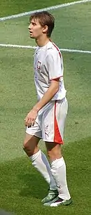 In Euro 2008 qualifying, Poland were drawn into a group with Portugal, Serbia, Finland, Belgium, Kazakhstan, Armenia and Azerbaijan.[86] Poland's campaign began in uncomfortable fashion, suffering a 1–3 defeat to Finland on 2 September 2006 and then drawing 1–1 with Serbia on 6 September.[87][88] In the third match, on 7 October, Poland won 1–0 over Kazakhstan, with Euzebiusz Smolarek scoring the goal.[89] On 11 October, Poland beat Portugal 2–1, with Smolarek scoring the two goals.[90] Poland beat Belgium 1–0 on 15 November.[91] On 24 March 2007, Poland beat Azerbaijan 5–0, and on 28 March beat Armenia 1–0.[92][93] On 2 June, they beat Azerbaijan 3–1, with Smolarek and Krzynówek (2) scoring.[94] On 6 June, Poland lost 1–0 to Armenia, on 8 September drew 2–2 with Portugal, and on 12 September drew 0–0 with Finland.[95][96][97] On 13 October, Poland beat Kazakhstan 3–1 with a hat-trick from Smolarek.[98] They beat Belgium 2–0 with two goals from Smolarek on 17 November, and on 21 November drew 2–2 with Serbia in the final qualifying game, thus qualifying for the tournament as the 1st place team in the qualifying group following Portugal's 0–0 draw with Finland. This was Poland's first ever Euro appearance.[99][100][101]