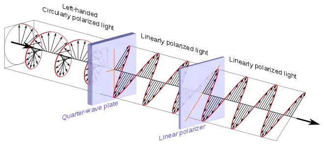 Because the quarter-wave plate is made of a birefringent material, when in the wave plate, the light travels at different speeds depending on the direction of its electric field. This means that the horizontal component which is along the slow axis of the wave plate will travel at a slower speed than the component that is directed along the vertical fast axis. Initially the two components are in phase, but as the two components travel through the wave plate the horizontal component of the light drifts farther behind that of the vertical. By adjusting the thickness of the wave plate one can control how much the horizontal component is delayed relative to vertical component before the light leaves the wave plate and they begin again to travel at the same speed. When the light leaves the quarter-wave plate the rightward horizontal component will be exactly one quarter of a wavelength behind the vertical component making the light left-hand circularly polarized when viewed from the receiver.[11]