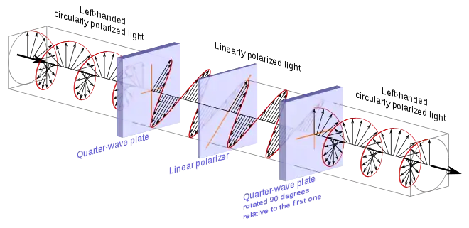 A homogeneous circular polarizer can be created by sandwiching a linear polarizer between two quarter-wave plates.[12] Specifically we take the circular polarizer described previously, which transforms circularly polarized light into linear polarized light, and add to it a second quarter-wave plate rotated 90° relative to the first one.
