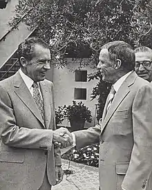 Sinatra remained a supporter of the Democratic Party until the early 1970s when he switched his allegiance to the Republican Party as the Democratic Party under George McGovern took a sharp turn to the left that was in conflict with his more traditional values.[19] The first sign of Sinatra's break from the Democratic Party came in 1970 when he endorsed Ronald Reagan for a second term as Governor of California;[8] Sinatra, however, remained a registered Democrat and encouraged Reagan to become more moderate.[8] In July 1972, after a lifetime of supporting Democratic presidential candidates, Sinatra announced he could not support the left-ward turn of the party and its candidate, George McGovern, and would therefore support Republican U.S. President Richard Nixon for re-election in the 1972 presidential election. His switch to the Republican Party was now official;[8] he even told his daughter, Tina, who had actively campaigned for McGovern,[8] "the older you get, the more conservative you get."[8] Sinatra said he agreed with the Republican Party on most positions.[20] During Nixon's presidency, Sinatra visited the White House on several occasions.[8]