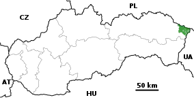 The park is located in the Snina District in the Prešov Region. It is adjacent to Bieszczady National Park in Poland, together they are part of the East Carpathian Biosphere Reserve. The highest point lies at 1,208 m (3,963 ft) AMSL on a point where the borders of Slovakia, Poland and Ukraine meet, near the summit of the mount Kremenec. The National Park is the easternmost and least populated area of the country. Hiking trails starts from several villages, most notably Nová Sedlica but also from Runina, Topoľa and Uličské Krivé.