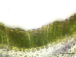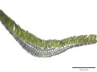 The lamellae, ridges of cells that run along the leaf surface, are crenulate (i.e. with small rounded teeth) in profile and are 5 to 9 cells high. Their margins are distinctly grooved with 2 rows of paired, projecting knobs. The marginal cells, when observed in section, may be narrow, but are more typically enlarged and wider than those beneath. They are retuse (i.e. with a rounded apex with a central shallow notch) to deeply notched, and in rare cases are divided by a vertical partition. These cells are smooth and brownish in colour and have relatively thick cell walls. The sheath cells measure 60 to 90 µm long by 10 to 13 µm wide. These cells may be elongated rectangles or strongly linear structures up to 20 times long as wide. They become narrower toward the margins. Marginal lamina cells are 10 to 15 µm wide and are subquadrate (i.e. nearly square).[3]