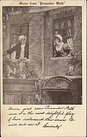 The complex is named for Pomander Walk, a romantic comedy by Louis N. Parker which opened in New York in 1910.[4][5][6] The play is set on an imaginary byway near London. The place as built bears a tenuous resemblance to the setting described in the play as "a retired crescent of five very small, old-fashioned houses near Chiswick, on the river-bank. ... They are exactly alike: miniature copies of Queen Anne mansions".[7]