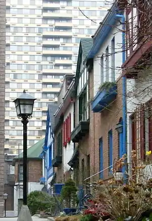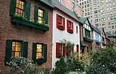Pomander Walk is a cooperative apartment complex in Manhattan, New York City, located on the Upper West Side between Broadway and West End Avenue. The complex consists of 27 buildings. Four buildings face West 94th Street, and another seven face West 95th Street, including one with a return facade on West End Avenue. The "Walk" itself, consisting of two rows of eight buildings facing each other across a narrow courtyard, runs through the middle of the block between 94th and 95th, with a locked gate at each end. Each building originally had one apartment on each floor. In recent years, some buildings have been reconfigured to serve as single-family homes.