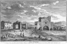 In antiquity, the Ponte Nomentano was located outside of the Aurelian Wall, at a distance of 3.9 km from the Porta Nomentana.[1] The East Roman historian Procopius records that the bridge was destroyed by the Ostrogoths under their king Totila around 547 AD during the Gothic War, but rebuilt by the victorious Roman general Narses in 552.[2] The still-intact late Republican fabric of the main arch, however, indicates that the bridge might have been only partially damaged in the event.[3]