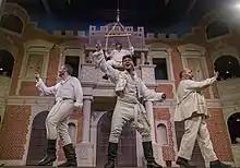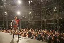 The foundation of performance at Pop-up Globe is the relationship between actors and audience. Direct address is the central feature of the way Shakespeare is played at Pop-up Globe, although some productions have varied the degree to which they embrace direct address as a tool. Allowances are made for what the artistic vision calls ‘judicious ad-libs’ as often the conditions of performance at Pop-up Globe—weather, planes flying overhead, unexpectedly boisterous audience members—mean that no two performances are the same and actors have to acknowledge the environment around them. Pop-up Globe productions make huge use of live original music and dance, and all productions have ended with a jig danced by the company, For the first three seasons of Pop-up Globe one company was a dedicated ‘Jacobean’ company, wearing 17th century dress and exploring original conditions of performance to various degrees, while the other company was ‘eclectic’ and not bound by any Early Modern conventions.