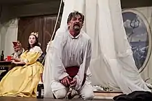 A Midsummer Night’s Dream (directed by Miles Gregory) had portions of its script translated into Te Reo Māori by Pierre Lyndon. The court and lovers wore Jacobean dress, the Mechanicals were dressed as modern tradies in hardhats and high-vis vests, and the fairy world of Oberon, Titania and Puck were attired in traditional Māori dress and much of their text delivered entirely in Te Reo Māori. Jason Te Kare doubled as Theseus and Oberon, Edward Peni played Hippolyta and Titania, and Reuben Butler originated the role of Puck. The same company performed The Merchant of Venice (directed by David Lawrence) in Jacobean dress in a production that tried to solve the play’s difficulties by embracing and amplifying them. Kevin Keys played Antonio, Sarah Griffin played Portia, Cameron Moore played Bassanio, and Peter Daubé played Shylock.