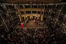 The interior design of the stage (43 feet (13 m) in width, as specified in the contract for the Fortune Playhouse) has changed significantly between the first and second seasons. The first season employed a canted scaenae frons across four audience bays at the rear of the stage, with four doors in a neo-classical design. The audience was seated in 360°, with “Lord’s” and “Gentlemen’s” rooms in the middle and upper galleries behind the stage. The 2017 season featured a flat scaenae frons with three doors in a baroque design, with the audience seated around 270°, with a balcony above the central door, and a musician's gallery above the balcony.[13]