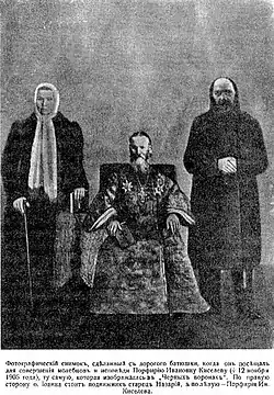 In her youth Matryona was a prostitute. Matryona Ivanovna Kiseleva was the spiritual daughter of John of Kronstadt. Kiseleva moved from Kronstadt to Oranienbaum in 1895, where the center of the sect's functioning moved after it, and she formed a community of women who lived under monastic discipline and worshiped at St. Andrew's Cathedral. She also attracted male followers from Saint Andrew's Cathedral of the sect consider Kiseleva a prophetess and called her «Theotokos» (bogoroditsa), «Porfiriia», «the porfiriia of the Tsar of Tsars», «Oranienbaum Mother of God». John's sectarians called «Jesus Christ — Tsar of Tsars». Other sectarians had names: Mikhail Petrov (Russian: Михаил Петров; the «Archangel Michael») is a Yaroslavl peasant, Elizaveta Korchacheva (Russian: Елизавета Коргачёва; «Solomoniia the Myrrh-bearer») is a former prostitute, Nazarii Dmitriev (Russian: Назарий Дмитриев; «John the Theologian») is a Novgorod peasant, Basilii Pustoshkin (Russian: Василий Пустошкин; «Elijah») is landlord Kronstadt Hospice House, Nicholai Bolshakov (Russian: Николай Большаков; «Enoch») is a bath attendant.