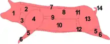 Pig tail, also referred to as pigtail and pork tail, are the tails from a pig used as a food ingredient in many cuisines.[1][2][3][4] Pig tails can be smoked,[5] fried,[6] or roasted in barbecue sauce (a specialty in Waterloo Region, Ontario).[7][8]
