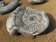 Ammonite, dinosaur and reptile fossils can be found on the foreshore and in the cliffs and because of this it is a Site of Special Scientific Interest.[1][11][12][13] However, digging fossils out of the crumbling cliffs and screes is dangerous.[14][15] The beach is composed of rock, sand and stones.[8] The Cleveland Way walking route passes along the top of the cliff.[16]