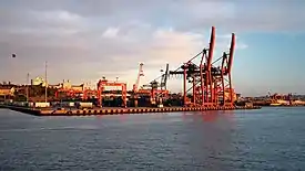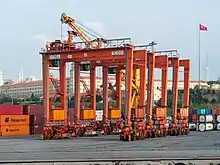 Total container handling capacity of the five container terminals is 1,700 vessels a year.[6] Operations are carried out by 4 quayside gantry cranes of 40 tons' capacity, 18 rubber-tired gantry cranes (40 tons' capacity), 9 reach stackers (25 to 42 tons) and 8 empty container forklifts (8 to 10 tons). Nine shore and yard cranes (3 to 35 tons), 6 mobile cranes (5 to 25 tons), 8 standard and 30 small-masted forklifts are also available. Another facility available at the terminal is the provision of reefer facilities for refrigerated containers.