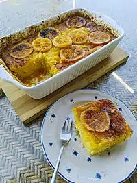 Portokalópita (in Greek, Πορτοκαλόπιτα; from πορτοκάλι portokáli "orange" and πιτα pita "cake") is a typical Greek cake whose main ingredient is sweet orange. Portokalópita is very popular in Greece and is usually consumed as a dessert with coffee.[1] Within Greek pastries, it belongs to the family of cakes called siropiasta, sweets that are bathed in syrup, such as baklava.[2] Although it has a sponge-like appearance, its dough is actually made from dry shreds of filo dough. (φύλλο phyllo), to which a mixture of Greek yogurt, egg and orange juice is added. Then is bathed on top with a syrup (liquid sugar) that has been simmered with oranges and sometimes flavored with vanilla and / or cinnamon. Ideally, it is consumed the next day or the day after, when the syrup is fully absorbed and all the flavors of the cake have been integrated.[2] The mouthfeel should be fluffy and juicy, preventing it from being compact.[3]