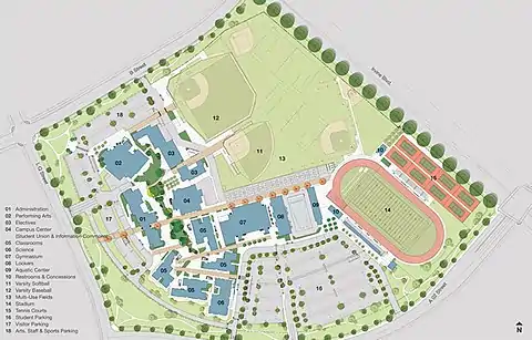 Many spaces have multiple uses; the cost savings allowed for construction of the theater, stadium, and aquatics center in the first phase rather than in a later expansion.[6]