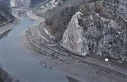 Rockfalls from the limestone cliffs of the Avon Gorge have caused a hazard to motorists on occasion and every year the road is closed to allow for inspection of the cliffs for potentially dangerous cracks and loose rocks, and to allow remedial works.[11] In 1980, a glass fibre reinforced concrete canopy was constructed over the Portway close to where it passes below the Clifton Suspension Bridge, in order to protect traffic from such rock falls.[12][13]