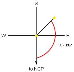 When graphing visual binaries, the NCP is, as in the illustration, normally drawn from the center point (origin) that is the Primary downward–that is, with north at bottom–and PA is measured counterclockwise. Also, the direction of the proper motion can, for example, be given by its position angle.