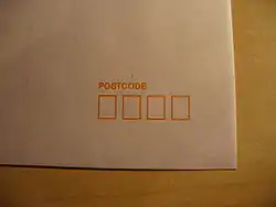 Australian envelopes and postcards often have four square boxes printed in orange at the bottom right for the postcode. These are used to assist with the automated sorting of mail that has been addressed by hand for Australian delivery.