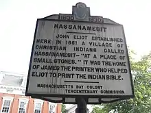 Praying towns were a series of settlements established by English colonial governments in New England from 1646 to 1675 in an effort to convert local Native Americans to Christianity.[1] The native people who moved into these towns were known as Praying Indians. Before 1674 the villages were the most ambitious experiment in converting Native Americans to Christianity in the Thirteen Colonies,[1] and led to the creation of the first books in an Algonquian language, including the first bible printed in British North America. During King Philip's War from 1675 to 1678, many praying towns were depopulated, in part due to forced internment of praying Indians on Deer Island, many of whom died during the winter of 1675. After the war, many of the originally allotted praying towns were never reestablished, however some praying towns persisted. Many present day indigenous groups in New England trace their heritage to praying towns, including the Mashpee Wampanoag, the Ponkapoag and Natick Massachusett, and the Chaubunagungamaug and Hassanamisco Nipmuc.