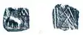 The goddess Lakshmi coins are either cast or struck.[2] The two coins illustrated below are cast. They are found in may sizes ranging from about 3 inches to half an inch. The obverse of these coins bear the image of the goddess holding lotus stalks, surmounted by two elephants pouring water. Initially these were thought to be votive offerings. but now scholars are unanimous that they were indeed coins.[1] They are early coins of the Chera Dynasty from about 500 BCE found in Kandarodai.