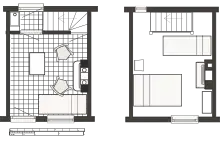Some two-room cottages were as small as 10 feet (3.0 m) by 10 feet (3.0 m). Their narrow steep stairs aligned with the side or back wall. The heating was an open coal-fired cast-iron cooking range in the living room, and maybe a cast-iron 'register grate'[lower-alpha 1] in the bedroom.[10]