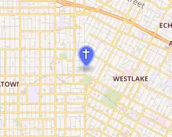 The formation of the Precious Blood parish was announced in 1923 by Los Angeles Bishop John J. Cantwell.[1] Since the zoning laws in the Occidental lot restricted building in a residential area at the time, a temporary church, built in the Gothic style at a cost of $10,000, was dedicated in May 1924 on Third Street between Coronado and Carondolet Avenues.[2] Bishop John J. Cantwell presided at the dedication, and Father Michael O'Halloran became the first pastor.[2]